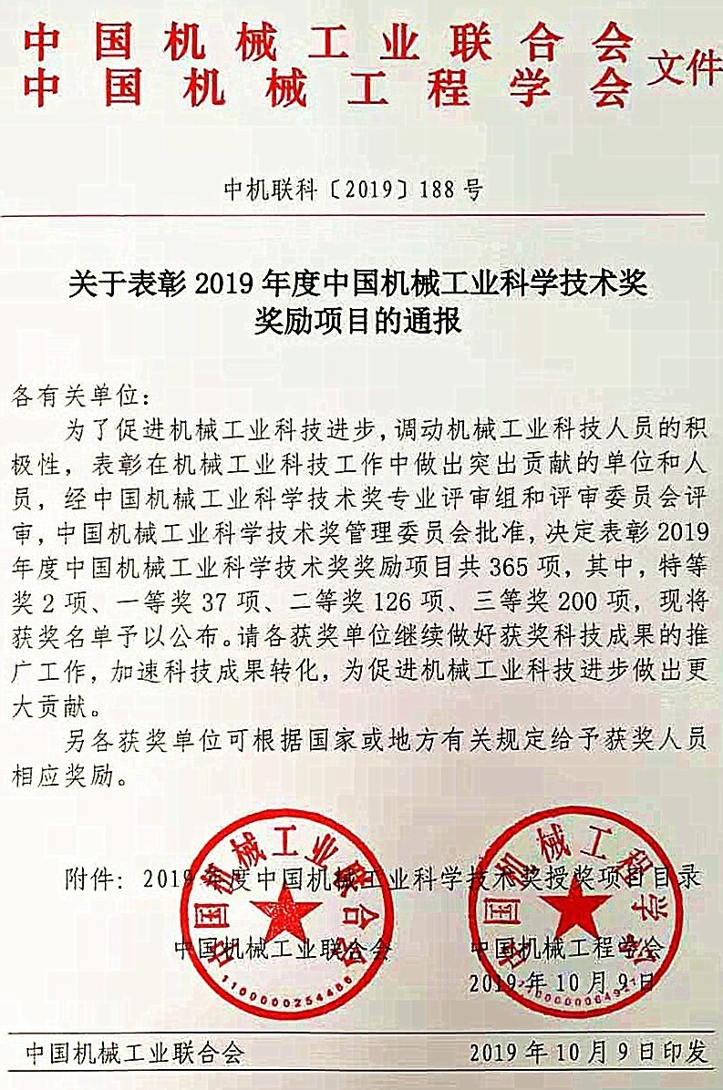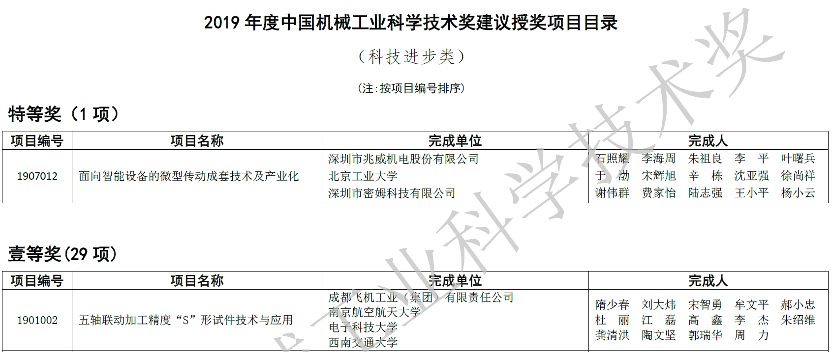2019年10月11日,中國機(jī)械工程學(xué)會(huì)官網(wǎng)發(fā)布了《關(guān)于表彰2019年度中國機(jī)械工業(yè)科學(xué)技術(shù)獎(jiǎng)獎(jiǎng)勵(lì)項(xiàng)目的通報(bào)》,其中我司與北京工業(yè)大學(xué)、深圳市密姆科技有限公司聯(lián)合開展的項(xiàng)目---面向智能設(shè)備的微型傳動(dòng)成套技術(shù)及產(chǎn)業(yè)化,榮獲科技進(jìn)步獎(jiǎng)特等獎(jiǎng)(證書編號(hào) R1907012-02 頒獎(jiǎng)信息:2019年度中國機(jī)械工業(yè)科學(xué)技術(shù)獎(jiǎng)?lì)C獎(jiǎng)大會(huì) http://www.cmiao.com.cn/cms/news/773.htm)。